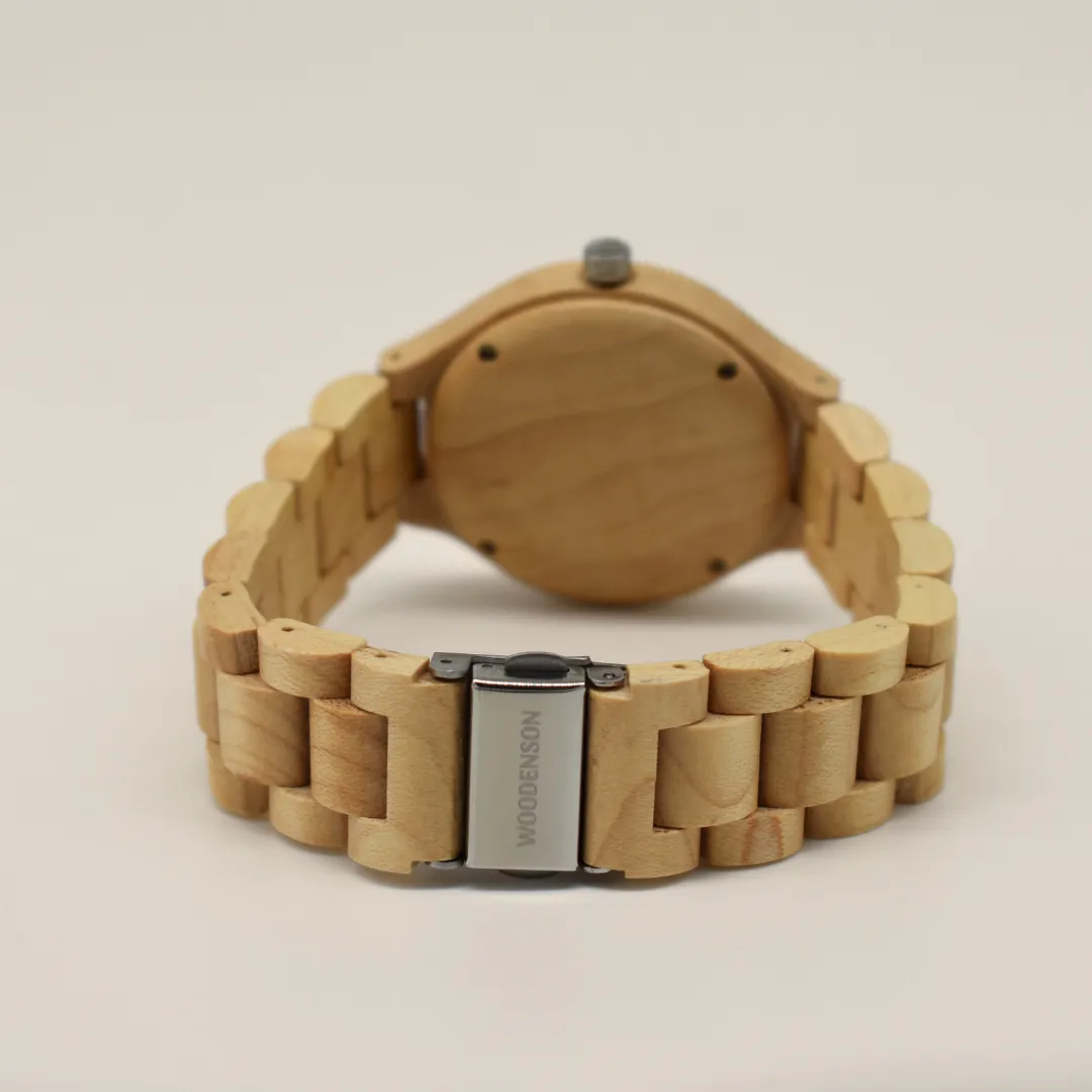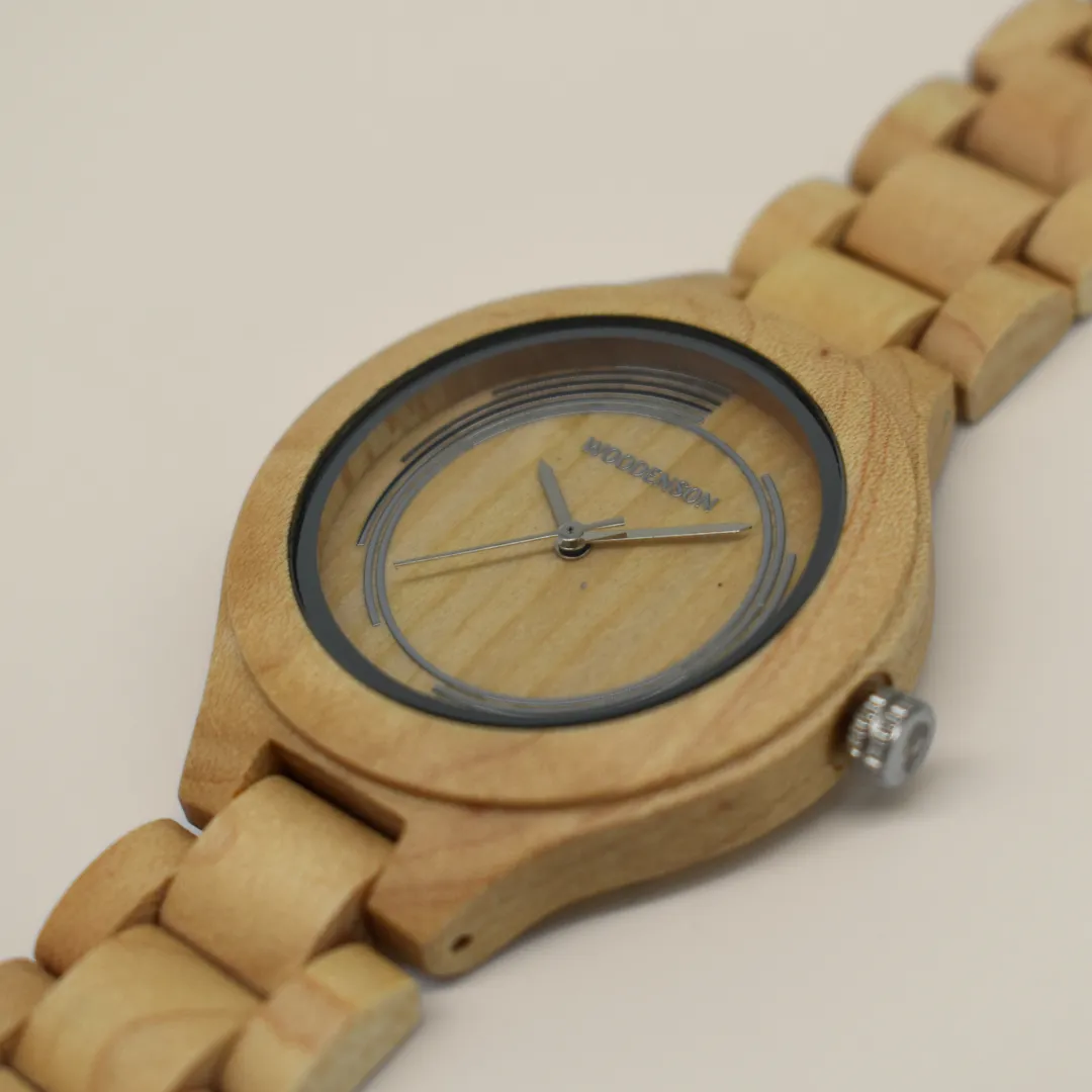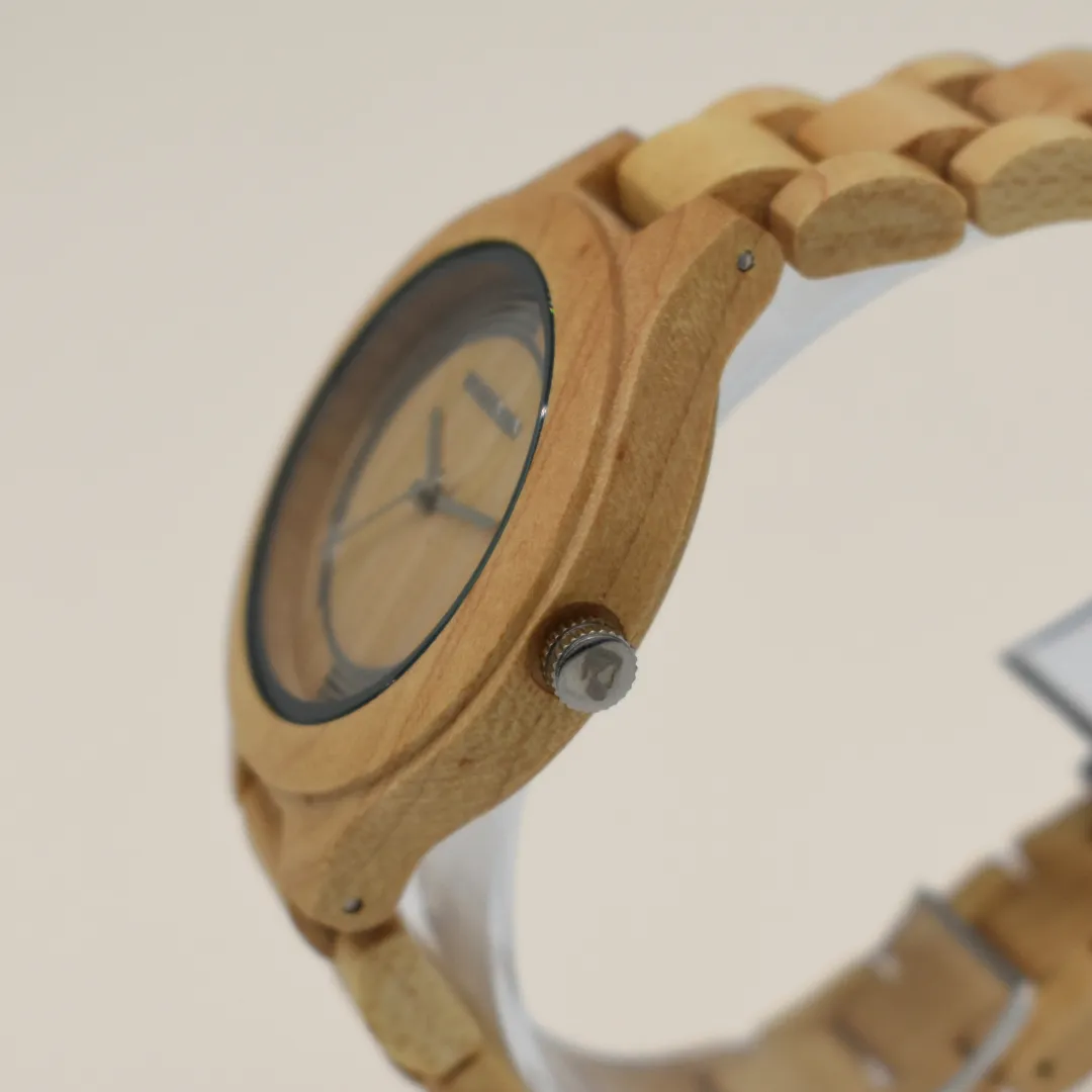 Specifiche tecniche Movimento: Quarzo giapponese (Miyota PC21S/PC21J). Massima affidabilità e minima manutenzione. Cassa: Legno naturale chiaro (probabile acero). Tocco morbido e finitura uniforme. Spessore: Circa 7 mm Vetro: Acrilico piano. Leggero e funzionale. Cinturino: Legno naturale con maglie solide. Fibbia metallica nascosta. Colore quadrante: Legno chiaro con anelli concentrici metallici come uniche marcature. Estetica minimal e raffinata. Fondello: Acciaio inossidabile. Chiusura a pressione. Funzioni: Ore, minuti, secondi (tre lancette) Chiusura: Fibbia nascosta con pulsante Peso totale: Circa 45–60 g